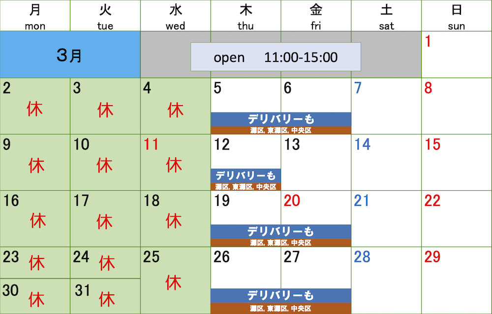 3月の営業カレンダーです。2026.