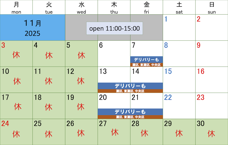 4(金)、25(金)はデリバリーは休業。店舗は通常営業です。