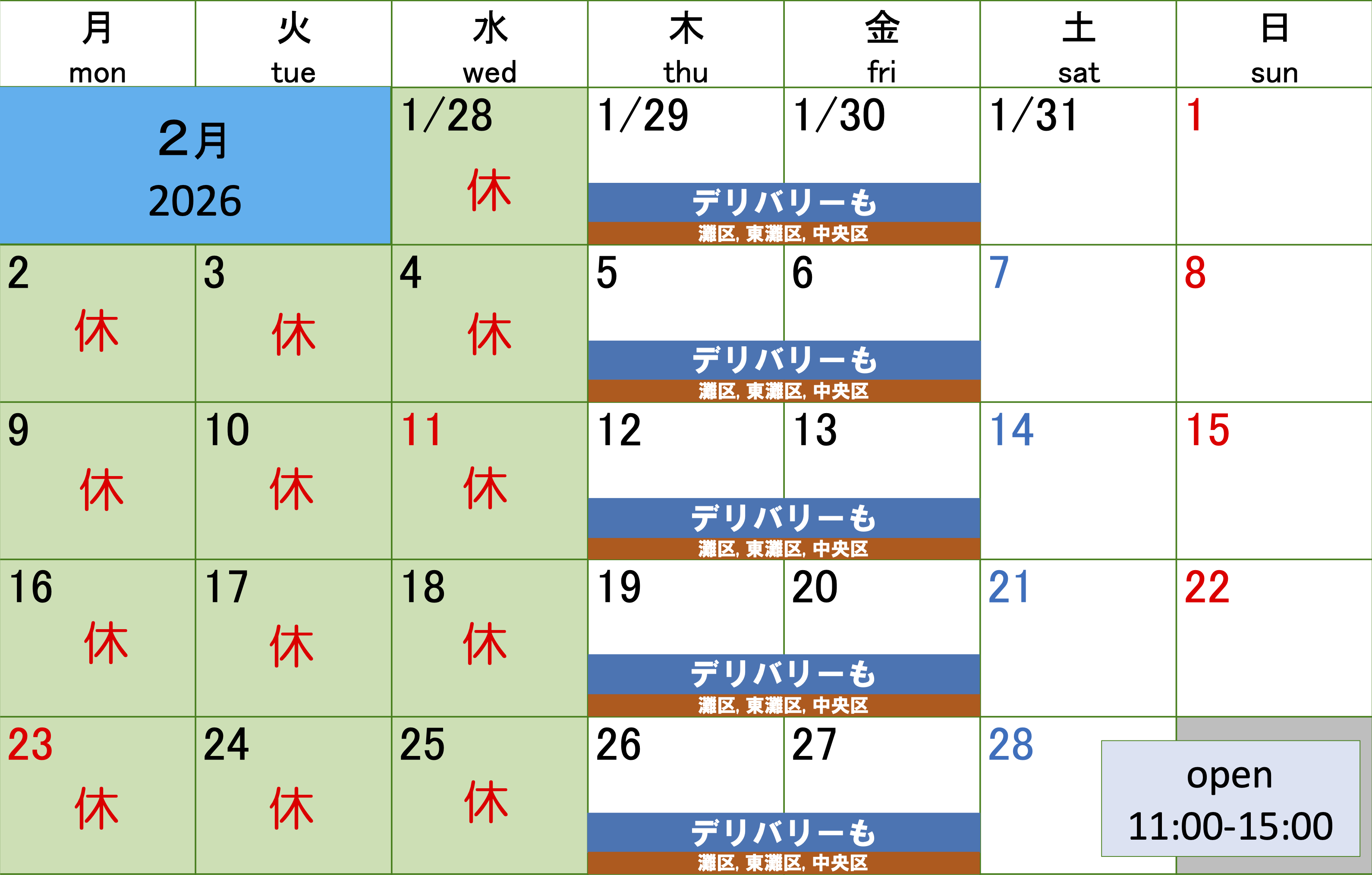 2月の営業カレンダーです。2026.