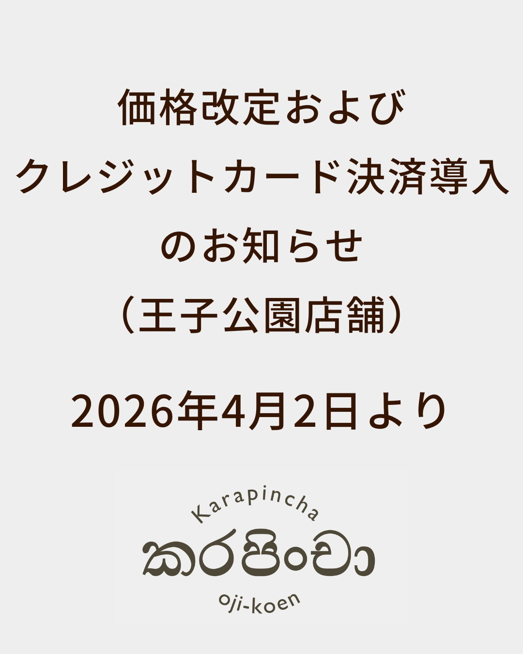 材料費、光熱費、人件費、輸入コスト等の上昇に対応するため、誠に勝手ながら、2026年4月2日より、飲食物の価格を改定いたします。